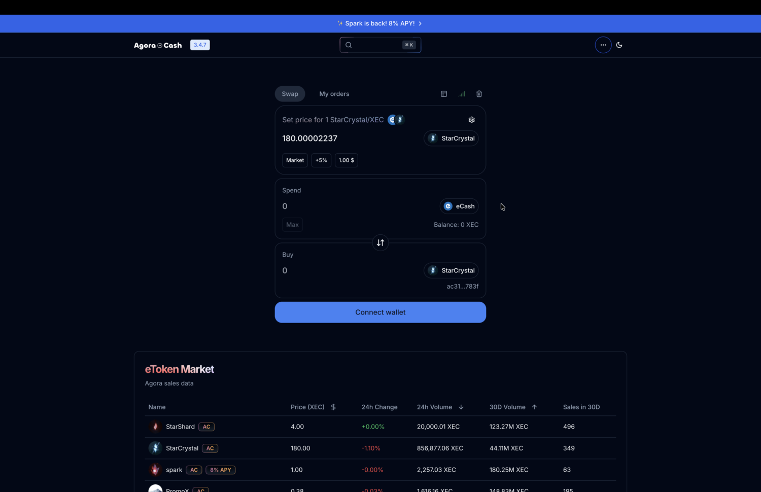 For a better user experience monitoring the market, finding tokens, reviewing price changes, etc., go to agora.cash.